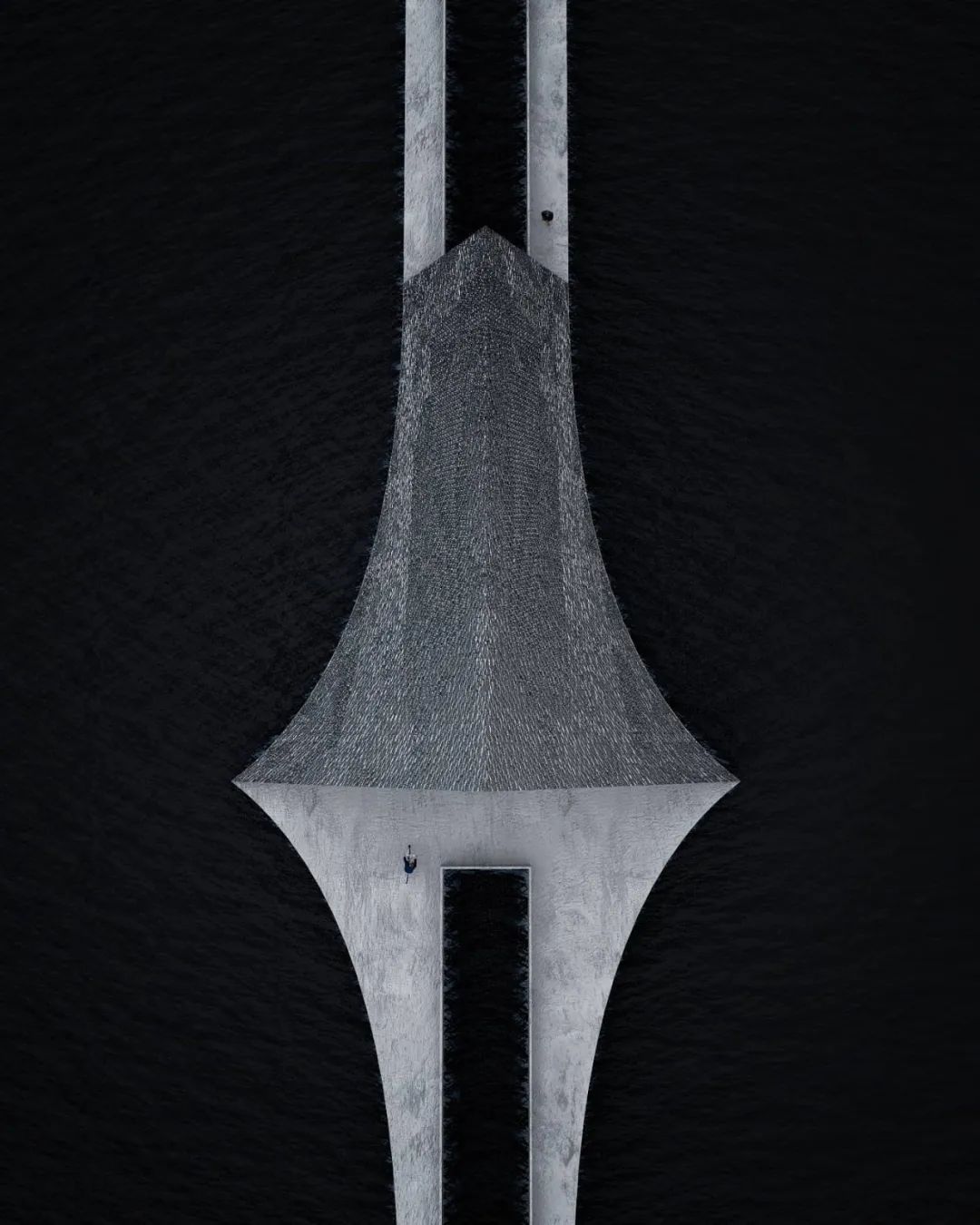 這些深蘊神秘力量的場景同時還具有極簡主義的哲學性,夸張的線條與孤獨的人物剪影互為對照,并以理念與精神層次的表達填補畫面的留白,激發(fā)人們的情感共鳴。那些為人所熟知的建筑因過大的尺度而變得十分陌生,Per Carlsen希望通過超現(xiàn)實的場景令人們重新審視自身,關注因我們習以為常而被忽略的環(huán)境現(xiàn)實。